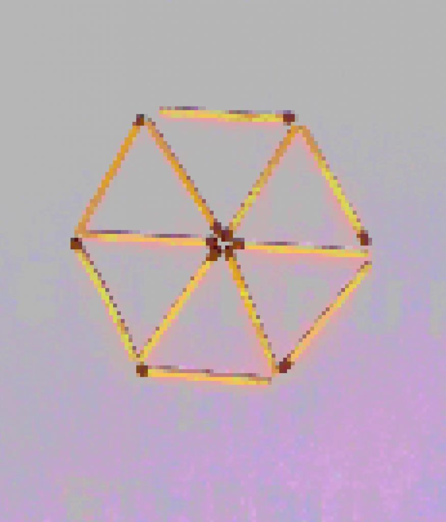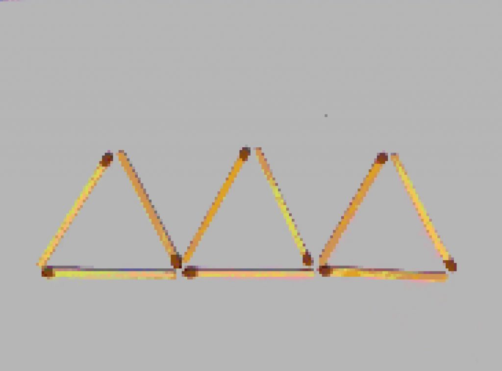 The challenge requires transforming this six triangle into a shape with three triangles, with a maximum repositioning of just four matches!!!